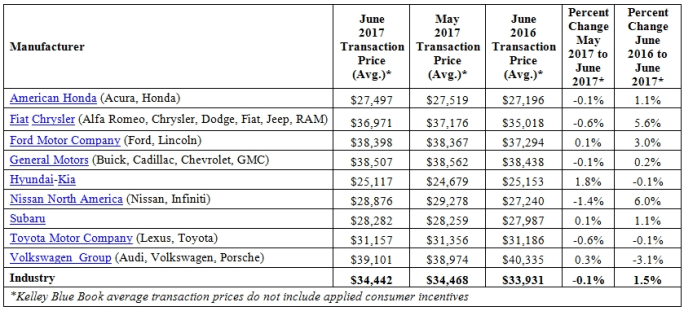 IRVINE, Calif. ─ Transaction prices grew slower than usual for the month of June, rising $511, or 1.5%, from a year ago to $34,442, according to Kelley Blue Book.