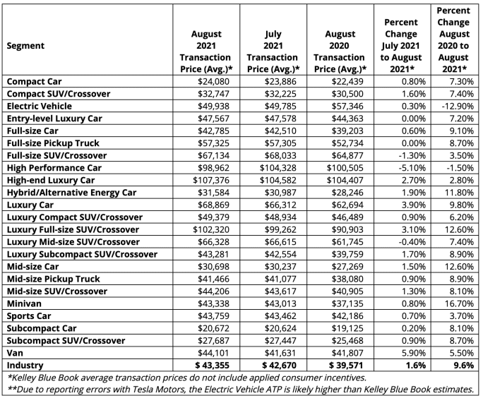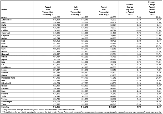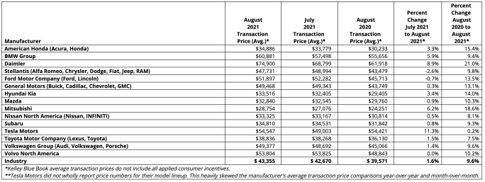 IRVINE, Calif. – According to a new report from Kelley Blue Book, new-vehicle prices hit another all-time high in August 2021, marking the fifth straight record-setting month. At $43,355, the average transaction price (ATP) for a new vehicle was up nearly 10% ($3,789) from one year ago in August 2020, and up 1.6% ($685) from July 2021.