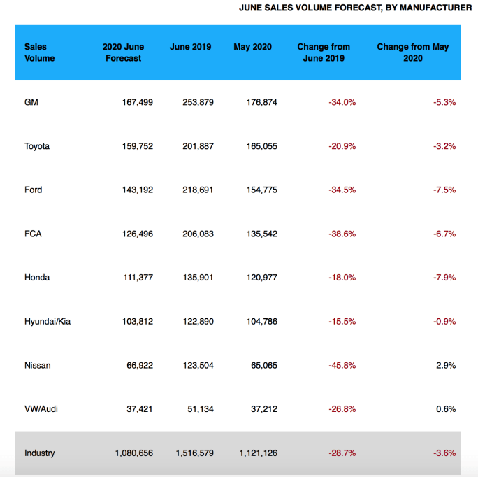 SANTA MONICA, Calif. — The car shopping experts at Edmunds say that June will be another down month for auto sales as the industry continues to combat market challenges posed by the coronavirus (COVID-19) pandemic, forecasting that 1,080,656 new cars and trucks will be sold in the U.S. in June for an estimated seasonally adjusted annual rate (SAAR) of 12.8 million. This reflects a 28.7% decrease in sales from June 2019 and a 3.6% decrease from May 2020.
