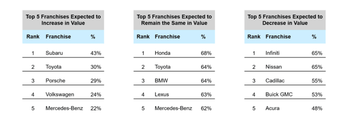 While the survey showed that dealers were notably optimistic about their own dealership values over the next 12 months, they also shared opinions about the direction of specific franchise values, pointing out potential winners as well as the franchises they felt would decline in value.