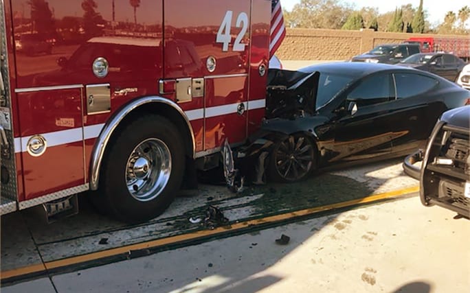 The driver of a Tesla Model S said the car was in “Autopilot” mode when it crashed into a fire truck in Culver City, Calif., on Jan. 22. Photo courtesy Culver City Fire Department via Twitter