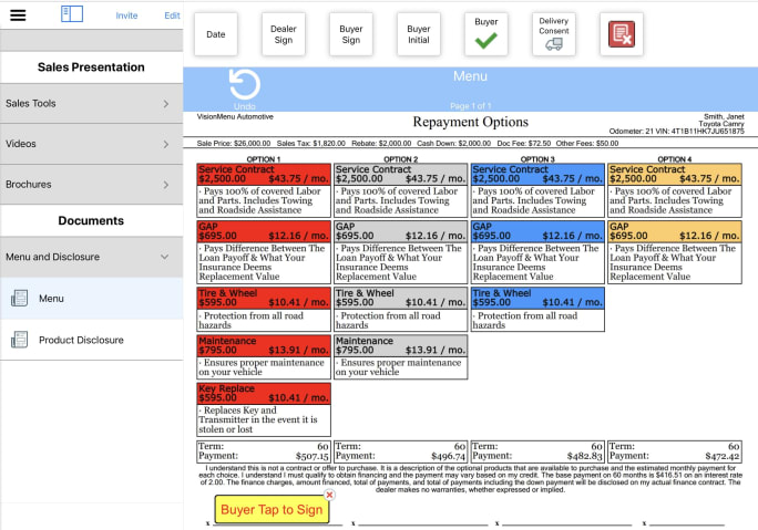 “VisionMenu is still our flagship product, but we are providing much more to our dealers than just a menu,” says Ron Martin, president of Vision Dealer Solutions. “In the last year we have added two new products: vSignature, which is an electronic signature tool, and Remote F&I, a tool that allows F&I managers to close F&I sales using the customer’s smartphone.