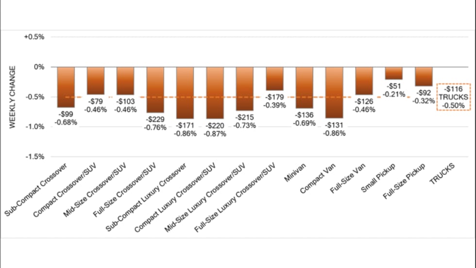 The volume-weighted, overall truck segment decreased 0.50%, smaller than the prior week’s decrease of 0.70%, though all 13 truck segments fell.