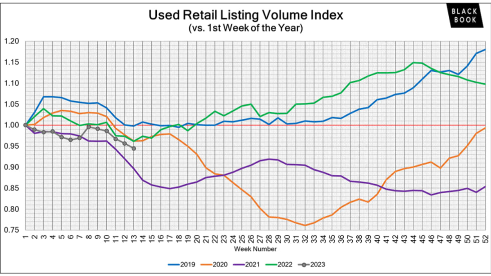 The used retail active listing volume index reverted back to one at the start of 2023. Currently, the index sits at 0.95 points.