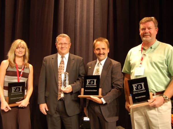 The Suburban Collection's Jodi Nicholson, Riverside Auto Group's Tom Wilson and Matt Dagenais, and Midland Honda's Robert Carter pose with their F&I Pacesetter of the Year awards.