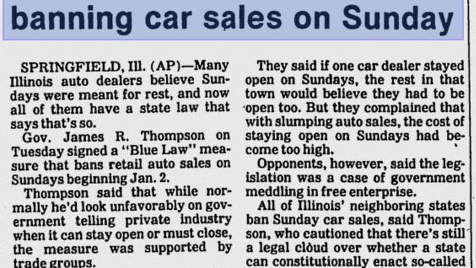 Illinois State Senator Jim Oberweis is proposing to lift the state’s ban on Sunday car sales, but car dealers, to his surprise, are opposed.
