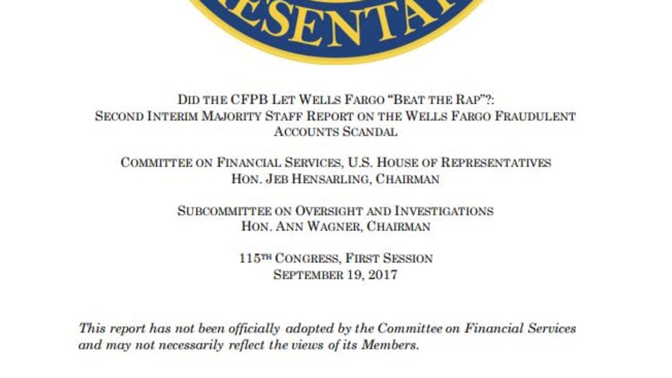House Republicans charged in a new report that the CFPB missed an opportunity to uncover Wells Fargo’s recently revealed insurance and GAP refund issues when it rushed to settle with the bank last year for opening unauthorized customer accounts. It also accused the bureau of withholding a memo backing its claims.